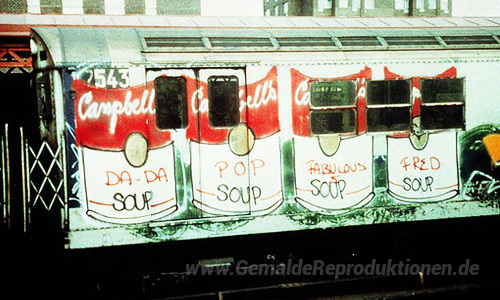 Wir bieten Ihnen eine handgefertigte Reproduktion auf Leinwand des berühmten Kunstwerks 'Soup Zug' von Fab 5 Freddy, aus dem Reproduktionsmuseum.