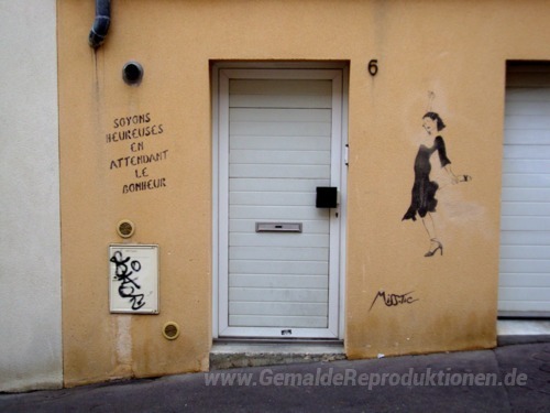 Wir bieten Ihnen eine handgefertigte Reproduktion auf Leinwand des berühmten Kunstwerks 'Soyons heureuse en attendant le bonheur' von Miss.Tic, aus dem Reproduktionsmuseum.