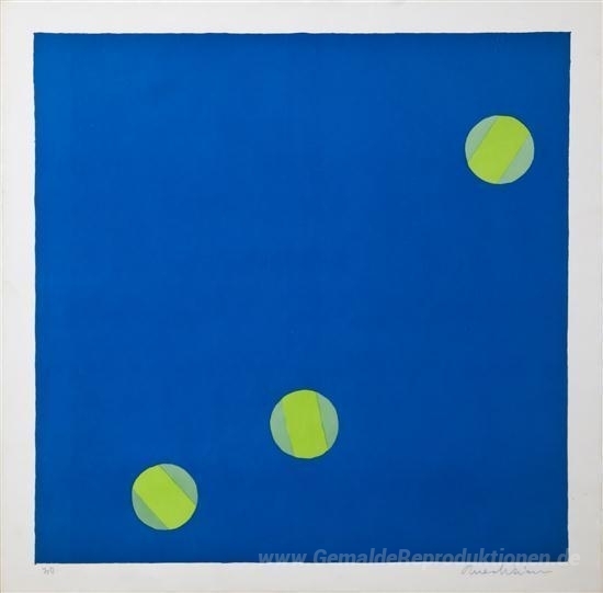 Wir bieten Ihnen eine handgefertigte Reproduktion auf Leinwand des berühmten Kunstwerks 'Untitled (blau mit grünen Kreisen)' von Edward Avedisian, aus dem Reproduktionsmuseum.