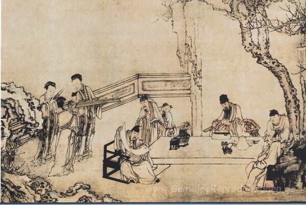 Wir bieten Ihnen eine handgefertigte Reproduktion auf Leinwand des berühmten Kunstwerks 'A Night Bankett im Pfirsich und Pflaumen Garten im Frühjahr' von Huang Shen, aus dem Reproduktionsmuseum.