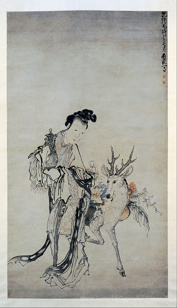 Wir bieten Ihnen eine handgefertigte Reproduktion auf Leinwand des berühmten Kunstwerks 'Ma-gu Holding ein Vase, mit einem Reh' von Huang Shen, aus dem Reproduktionsmuseum.