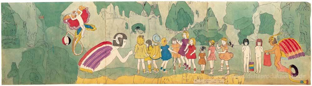 Willkommen in der faszinierenden Welt der Ölgemälde, in der Meisterwerke wie 73 Bei Jennie Richee Flucht durch ihre Hilfe von Henry Darger darauf warten, Ihr Zuhause zu bereichern. In der Kunst von Darger, einem Autodidakten, der erst posthum Anerkennung fand, entfaltet sich eine einzigartige Bildsprache. Seine Arbeiten sind geprägt von lebendigen Farben und detailreichen Kompositionen, die den Betrachter in eine verträumte, oft mystische Welt entführen.