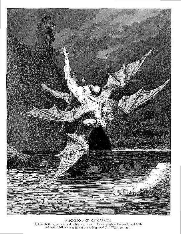 Wir bieten Ihnen eine handgefertigte Reproduktion auf Leinwand des berühmten Kunstwerks 'Alichino & Calcabrina' von Gustave Dore, aus dem Reproduktionsmuseum.