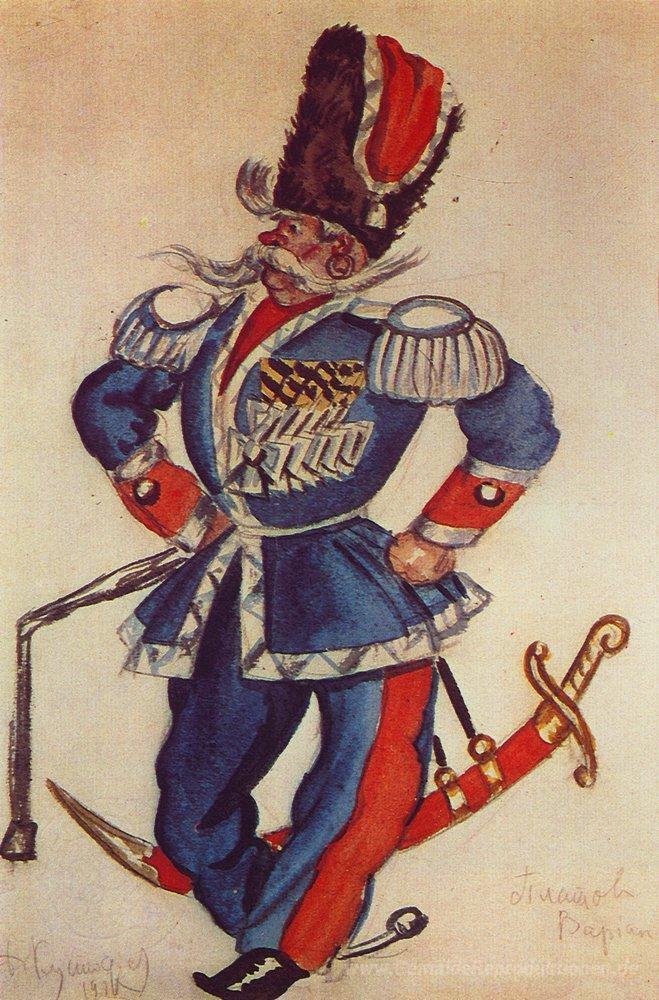Willkommen in der faszinierenden Welt der Ölgemälde, wo jedes Kunstwerk nicht nur ein visuelles Meisterwerk darstellt, sondern auch eine Geschichte erzählt. Entdecken Sie das beeindruckende Gemälde Ataman Platow von dem renommierten Künstler Boris Kustodiev. Kustodiev, bekannt für seine eindrucksvollen Darstellungen russischer Themen, fängt mit seiner einzigartigen Farbpalette und geschickten Pinselstrichen die Essenz seiner Protagonisten ein und verleiht jedem Werk eine unverwechselbare Tiefe.