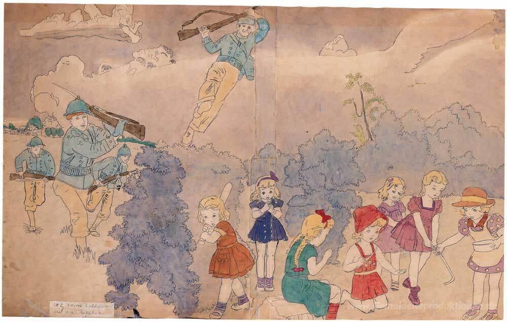 Wir bieten Ihnen eine handgefertigte Reproduktion auf Leinwand des berühmten Kunstwerks 'Bei 5 Norma Catherine. Sind aber zurückerobert.' von Henry Darger, aus dem Reproduktionsmuseum.