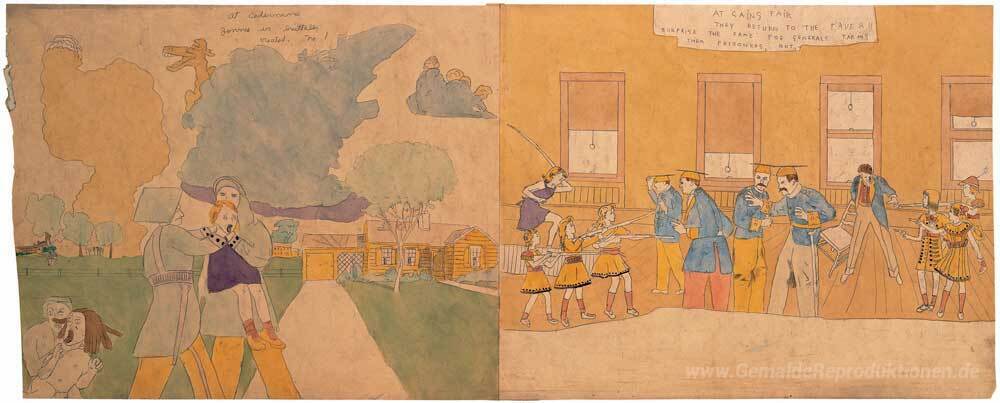 Wir bieten Ihnen eine handgefertigte Reproduktion auf Leinwand des berühmten Kunstwerks 'Bei Cedernine Jennie ist bruttally behandelt. No 1 / Am Cains Me' von Henry Darger, aus dem Reproduktionsmuseum.