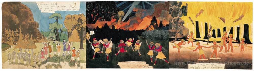 Wir bieten Ihnen eine handgefertigte Reproduktion auf Leinwand des berühmten Kunstwerks 'Bei Sunbeam Creek' von Henry Darger, aus dem Reproduktionsmuseum.
