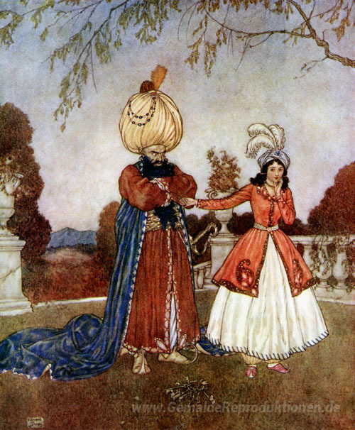 Wir bieten Ihnen eine handgefertigte Reproduktion auf Leinwand des berühmten Kunstwerks 'Blaubart - aus dem Bilderbuch für das Rote Kreuz' von Edmund Dulac, aus dem Reproduktionsmuseum.