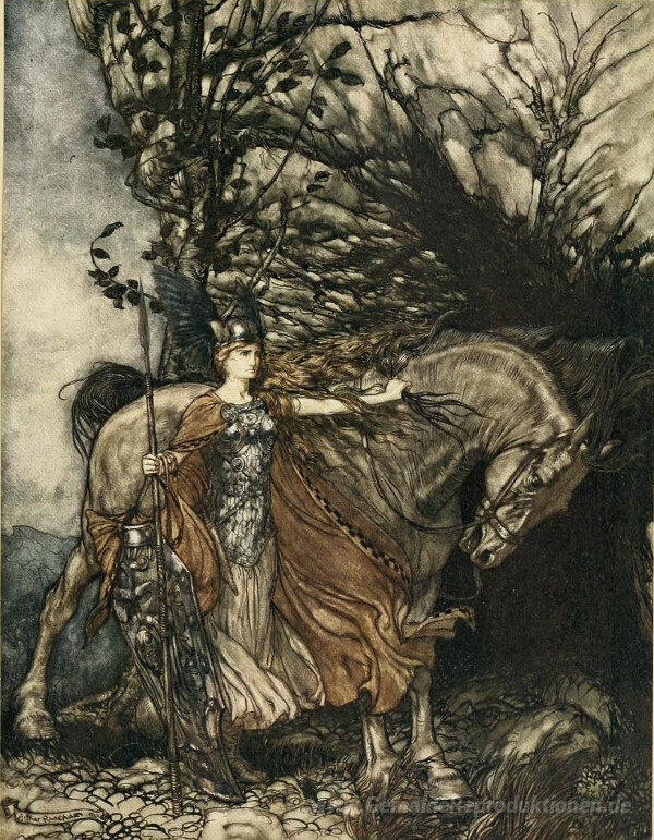 Wir bieten Ihnen eine handgefertigte Reproduktion auf Leinwand des berühmten Kunstwerks 'Brünnhilde mit ihrem Pferd, an der Mündung der Höhle' von Arthur Rackham, aus dem Reproduktionsmuseum.