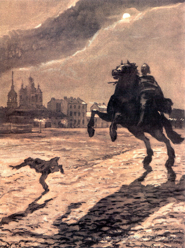 Wir bieten Ihnen eine handgefertigte Reproduktion auf Leinwand des berühmten Kunstwerks 'Bronze Horseman. Entwurf für eine Abdeckung, um Puschkins Gedich' von Alexandre Benois, aus dem Reproduktionsmuseum.