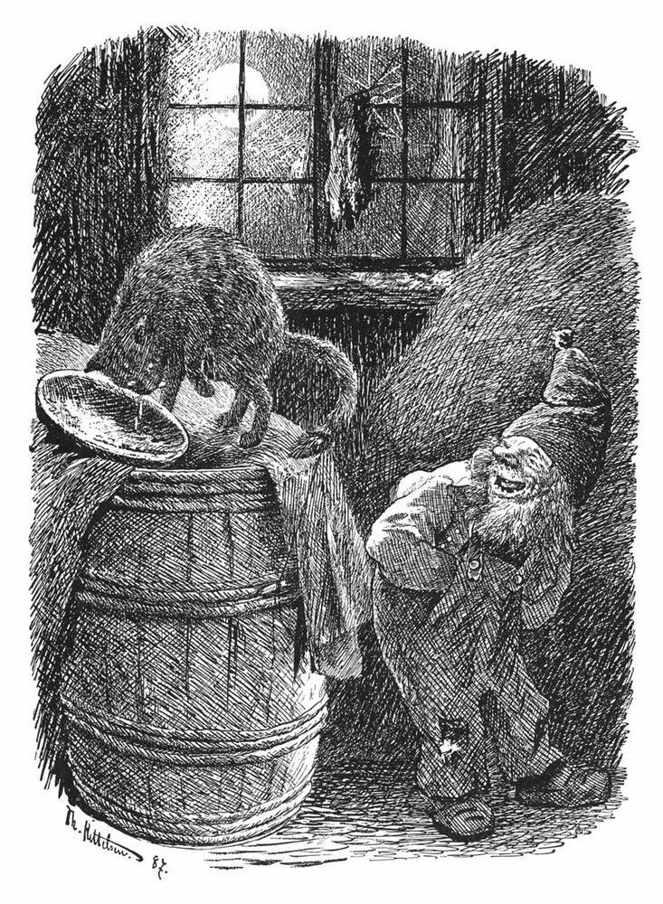 Wir bieten Ihnen eine handgefertigte Reproduktion auf Leinwand des berühmten Kunstwerks 'Brownie Mocks an der Katze' von Theodor Severin Kittelsen, aus dem Reproduktionsmuseum.