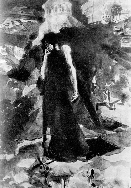 Wir bieten Ihnen eine handgefertigte Reproduktion auf Leinwand des berühmten Kunstwerks 'Dämon durch die Wände des Klosters' von Mikhail Vrubel, aus dem Reproduktionsmuseum.
