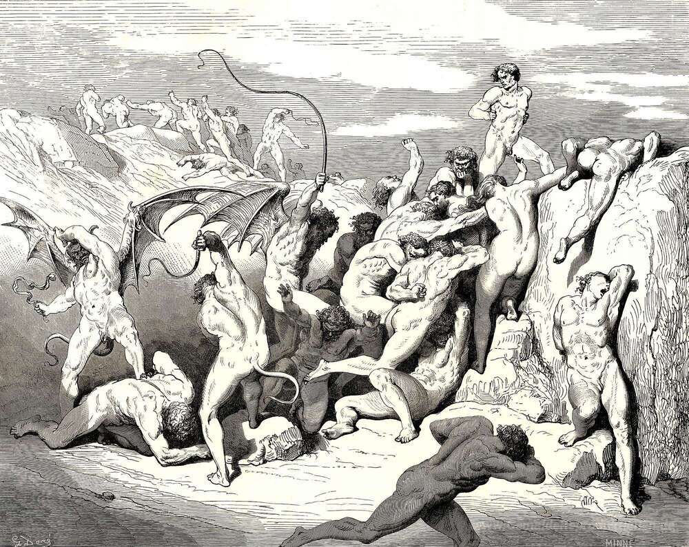 Wir bieten Ihnen eine handgefertigte Reproduktion auf Leinwand des berühmten Kunstwerks 'Das Inferno, Canto 18' von Gustave Dore, aus dem Reproduktionsmuseum.