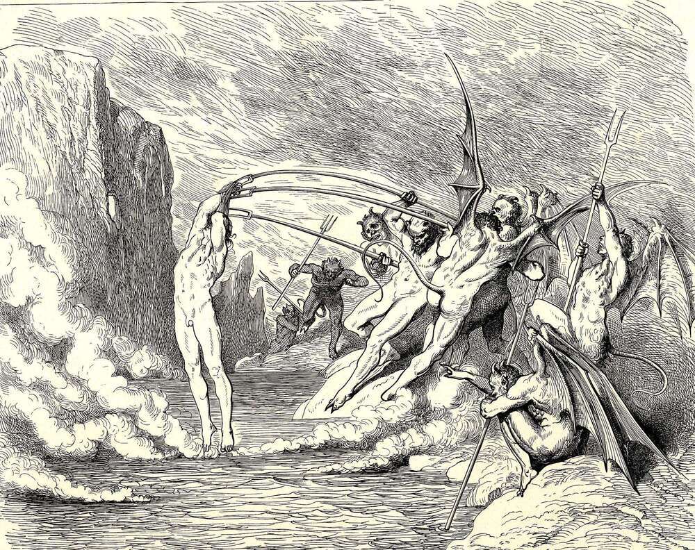 Wir bieten Ihnen eine handgefertigte Reproduktion auf Leinwand des berühmten Kunstwerks 'Das Inferno, Canto 21' von Gustave Dore, aus dem Reproduktionsmuseum.