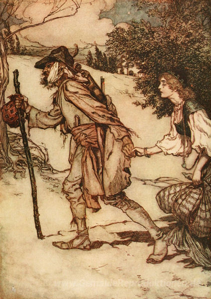 Wir bieten Ihnen eine handgefertigte Reproduktion auf Leinwand des berühmten Kunstwerks 'Der Bettler nahm sie bei der Hand und führte sie weg' von Arthur Rackham, aus dem Reproduktionsmuseum.