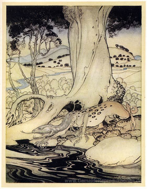 Wir bieten Ihnen eine handgefertigte Reproduktion auf Leinwand des berühmten Kunstwerks 'Der Drache in den Wäldern in der Nähe von Dublin' von Arthur Rackham, aus dem Reproduktionsmuseum.