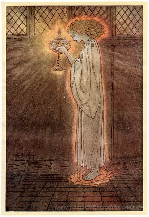 Wir bieten Ihnen eine handgefertigte Reproduktion auf Leinwand des berühmten Kunstwerks 'Der Heilige Gral ist in durchgeführt' von Arthur Rackham, aus dem Reproduktionsmuseum.