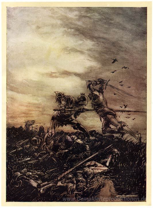 Wir bieten Ihnen eine handgefertigte Reproduktion auf Leinwand des berühmten Kunstwerks 'Der Kampf zwischen König Arthur und Modred' von Arthur Rackham, aus dem Reproduktionsmuseum.