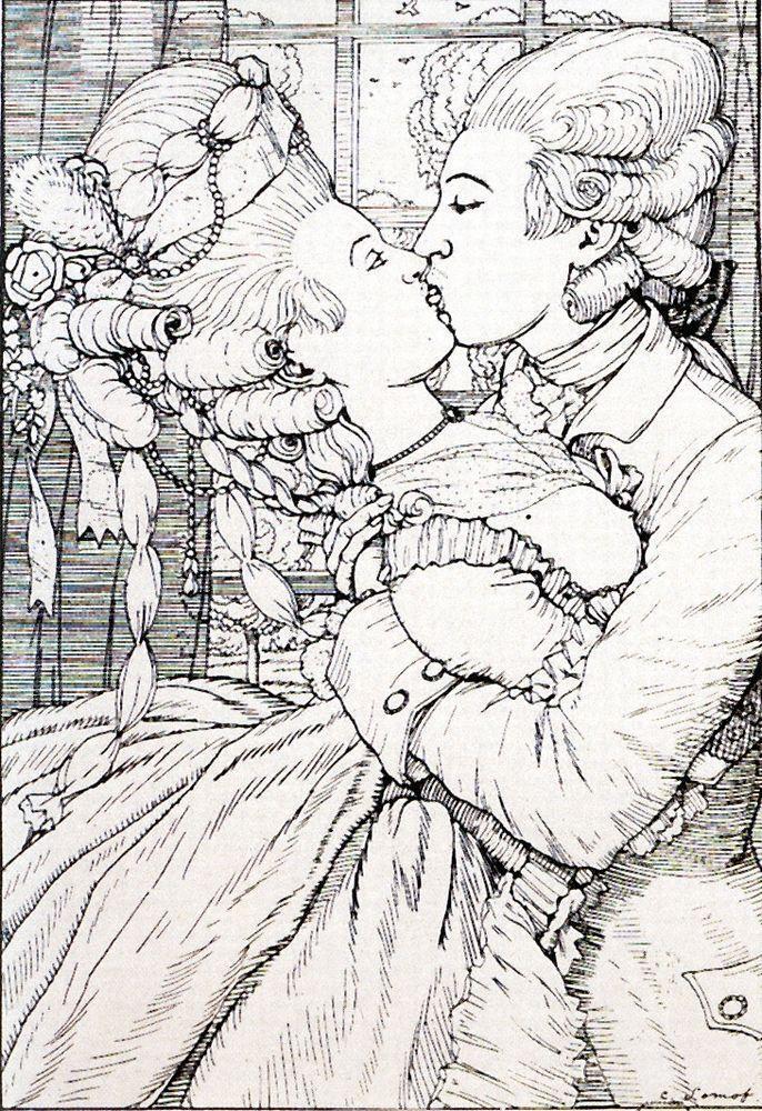 Wir bieten Ihnen eine handgefertigte Reproduktion auf Leinwand des berühmten Kunstwerks 'Der Kuss. Illustration für das Buch der Marquise' von Konstantin Somov, aus dem Reproduktionsmuseum.