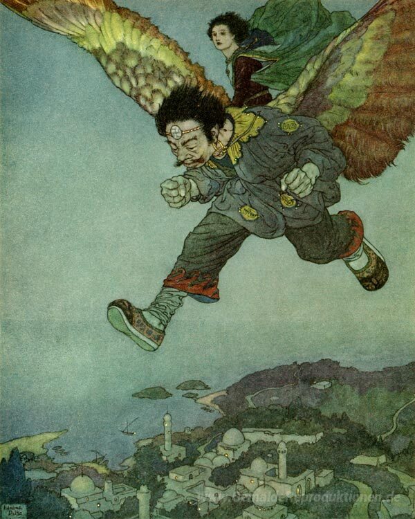 Wir bieten Ihnen eine handgefertigte Reproduktion auf Leinwand des berühmten Kunstwerks 'Der Ostwind flog noch schneller (aus dem Garten des Paradieses)' von Edmund Dulac, aus dem Reproduktionsmuseum.