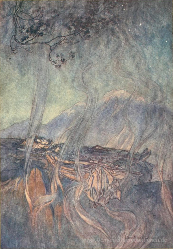 Wir bieten Ihnen eine handgefertigte Reproduktion auf Leinwand des berühmten Kunstwerks 'Der Schlaf der Brünnhilde' von Arthur Rackham, aus dem Reproduktionsmuseum.
