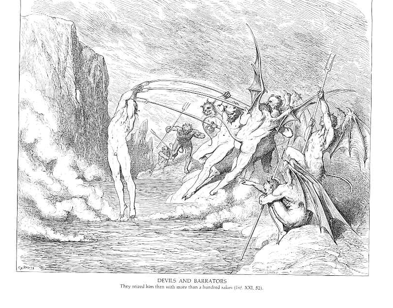 Wir bieten Ihnen eine handgefertigte Reproduktion auf Leinwand des berühmten Kunstwerks 'Devils und Barrators' von Gustave Dore, aus dem Reproduktionsmuseum.