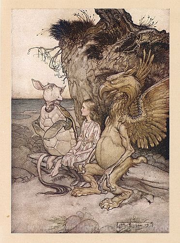 Wir bieten Ihnen eine handgefertigte Reproduktion auf Leinwand des berühmten Kunstwerks 'Die falsche Schildkröte holte tief Luft und sagte: "Das ist sehr' von Arthur Rackham, aus dem Reproduktionsmuseum.