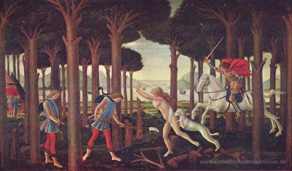 Wir bieten Ihnen eine handgefertigte Reproduktion auf Leinwand des berühmten Kunstwerks 'Die Geschichte von Nastagio degli Onesti (I), von The Decameron,' von Sandro Botticelli, aus dem Reproduktionsmuseum.