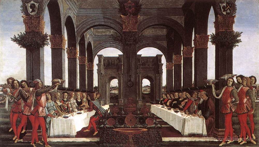 Wir bieten Ihnen eine handgefertigte Reproduktion auf Leinwand des berühmten Kunstwerks 'Die Geschichte von Nastagio degli Onesti' von Sandro Botticelli, aus dem Reproduktionsmuseum.