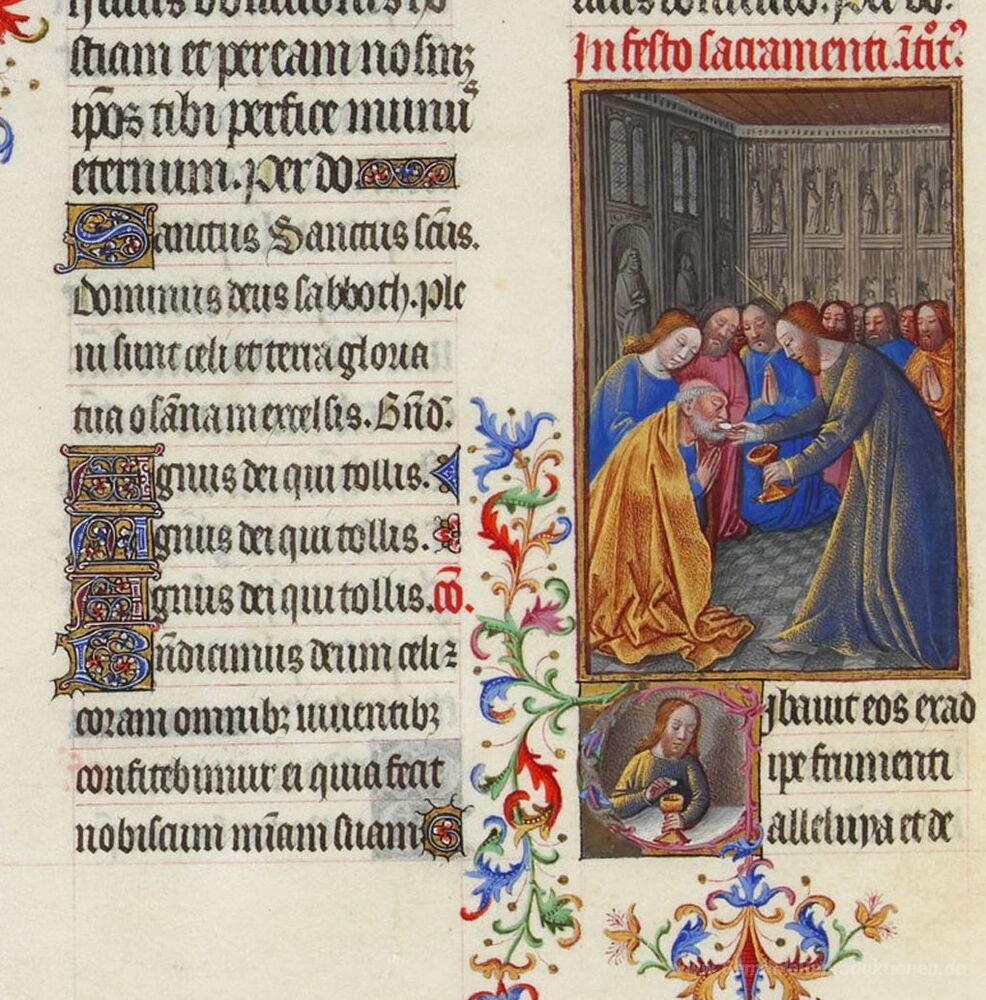 Wir bieten Ihnen eine handgefertigte Reproduktion auf Leinwand des berühmten Kunstwerks 'Die Kommunion der Apostel' von Limbourg brothers, aus dem Reproduktionsmuseum.