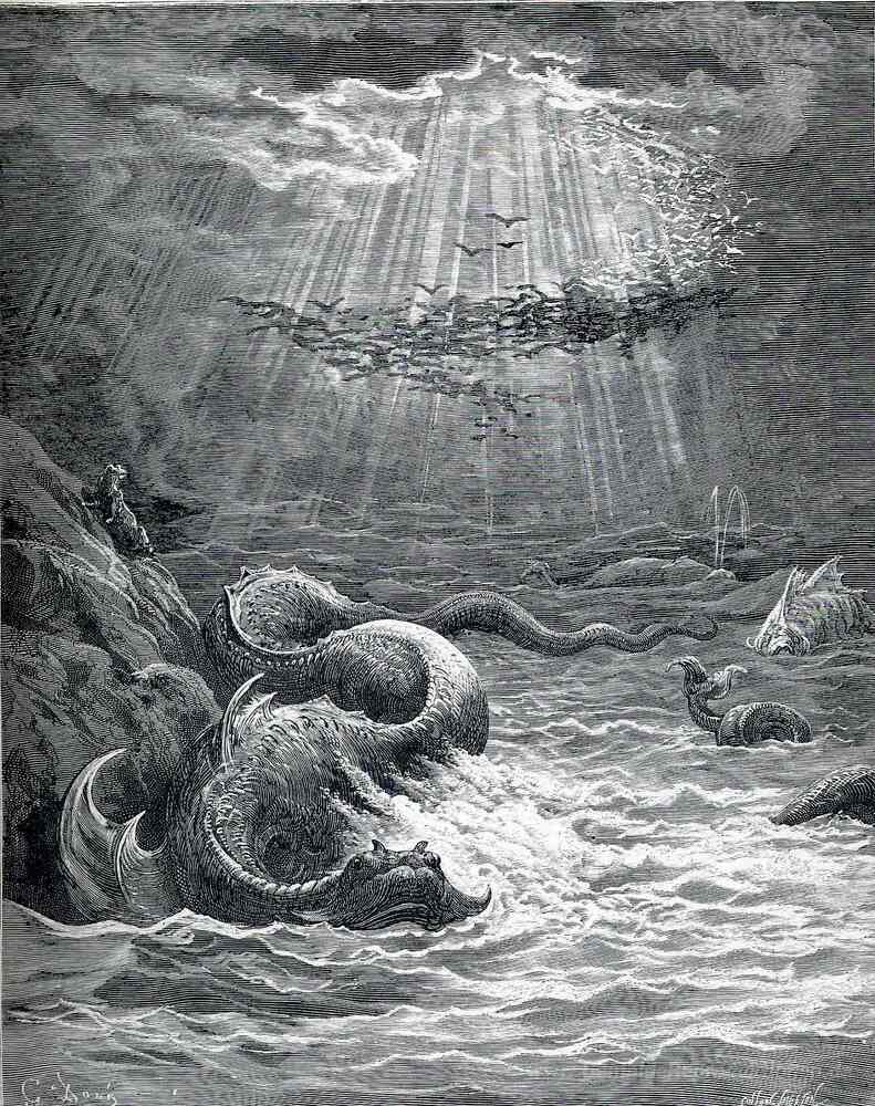 Wir bieten Ihnen eine handgefertigte Reproduktion auf Leinwand des berühmten Kunstwerks 'Die Schaffung von Fischen und Vögeln' von Gustave Dore, aus dem Reproduktionsmuseum.