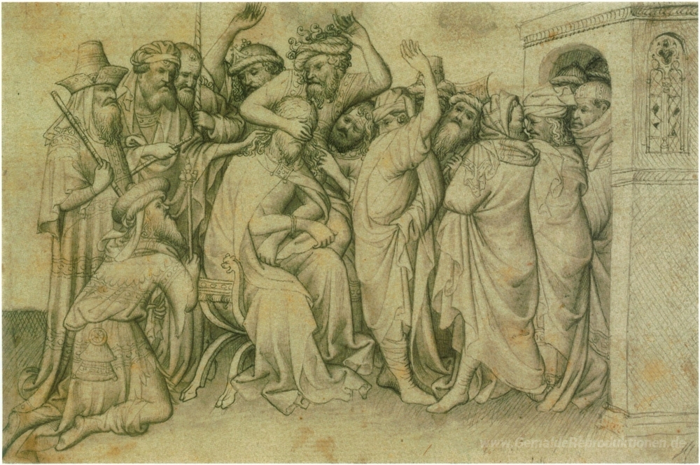 Wir bieten Ihnen eine handgefertigte Reproduktion auf Leinwand des berühmten Kunstwerks 'Die Verspottung Christi' von Limbourg brothers, aus dem Reproduktionsmuseum.