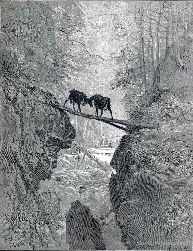 Wir bieten Ihnen eine handgefertigte Reproduktion auf Leinwand des berühmten Kunstwerks 'Die Zwei Ziegen' von Gustave Dore, aus dem Reproduktionsmuseum.