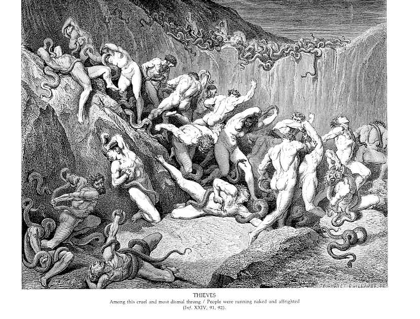 Wir bieten Ihnen eine handgefertigte Reproduktion auf Leinwand des berühmten Kunstwerks 'Diebe' von Gustave Dore, aus dem Reproduktionsmuseum.