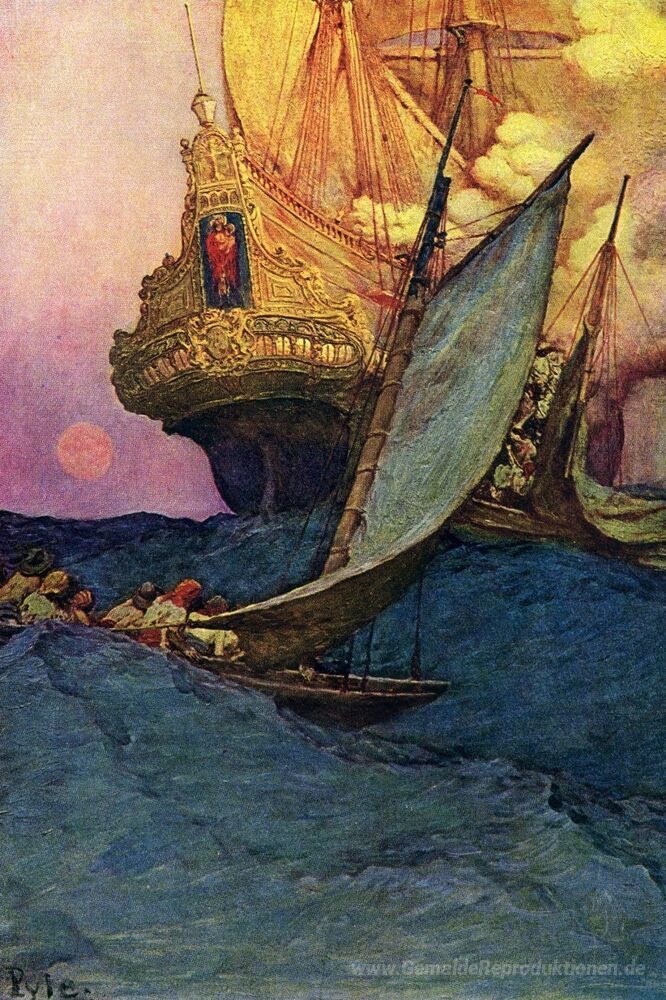 Willkommen in unserer exklusiven Kollektion von Ölgemälden, die die Faszination und Tiefe der Malerei durch talentierte Künstler widerspiegeln. Eines der herausragendsten Werke, das Sie finden werden, ist Ein Angriff auf eine Galleon von dem legendären Künstler Howard Pyle. Pyle, bekannt für seinen meisterhaften Umgang mit Licht und Schatten, fängt in diesem Kunstwerk die dramatische Spannung eines historischen Seegefechts ein. Sein unverwechselbarer Stil kombiniert Realismus mit einem Hauch von Romantik, was die Betrachter zu einer emotionalen Erfahrung einlädt.