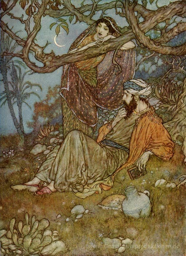 Wir bieten Ihnen eine handgefertigte Reproduktion auf Leinwand des berühmten Kunstwerks 'Ein Laib Brot, Die Rubaiyat von Omar Khayyam' von Edmund Dulac, aus dem Reproduktionsmuseum.