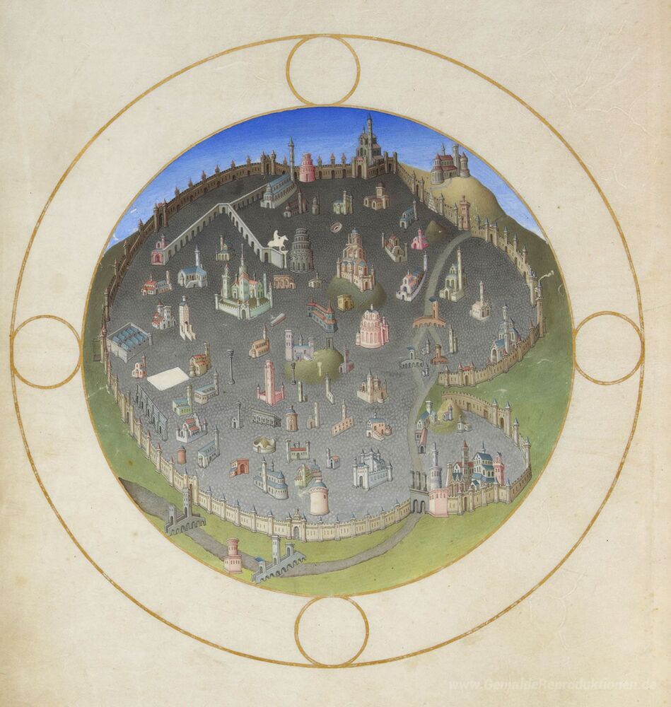 Wir bieten Ihnen eine handgefertigte Reproduktion auf Leinwand des berühmten Kunstwerks 'Ein Plan von Rom' von Limbourg brothers, aus dem Reproduktionsmuseum.