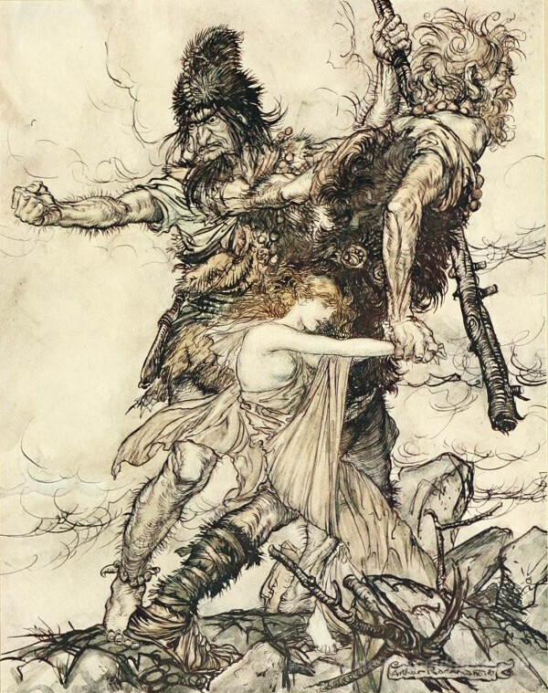 Wir bieten Ihnen eine handgefertigte Reproduktion auf Leinwand des berühmten Kunstwerks 'Fasolt plötzlich ergreift Freia und zieht sie auf der einen Seit' von Arthur Rackham, aus dem Reproduktionsmuseum.