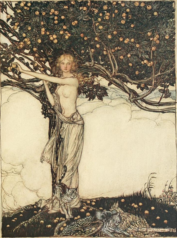Wir bieten Ihnen eine handgefertigte Reproduktion auf Leinwand des berühmten Kunstwerks 'Freia, die Schöne' von Arthur Rackham, aus dem Reproduktionsmuseum.