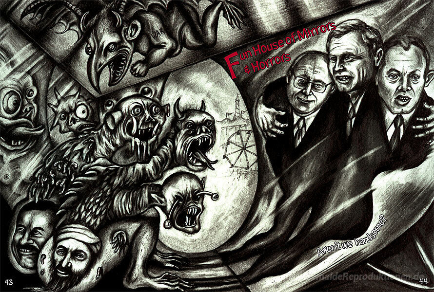 Wir bieten Ihnen eine handgefertigte Reproduktion auf Leinwand des berühmten Kunstwerks 'Funhouse' von Sue Coe, aus dem Reproduktionsmuseum.