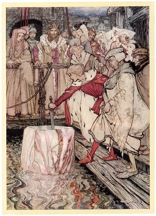 Wir bieten Ihnen eine handgefertigte Reproduktion auf Leinwand des berühmten Kunstwerks 'Galahad zieht das Schwert aus dem schwimmenden Stein' von Arthur Rackham, aus dem Reproduktionsmuseum.