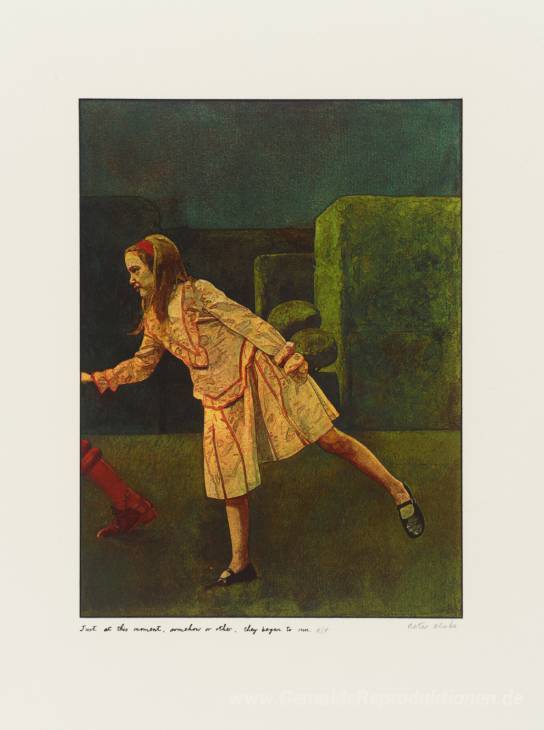 Wir bieten Ihnen eine handgefertigte Reproduktion auf Leinwand des berühmten Kunstwerks 'Genau in diesem Moment, so oder so, begannen sie zu laufen' von Peter Blake, aus dem Reproduktionsmuseum.