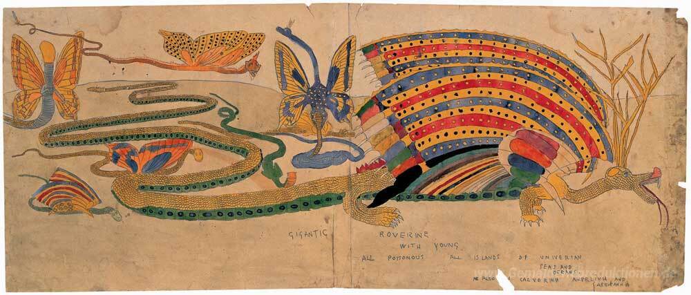 Wir bieten Ihnen eine handgefertigte Reproduktion auf Leinwand des berühmten Kunstwerks 'Gigantische Roverine ...' von Henry Darger, aus dem Reproduktionsmuseum.