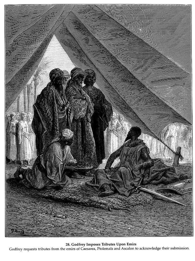 Wir bieten Ihnen eine handgefertigte Reproduktion auf Leinwand des berühmten Kunstwerks 'Godfrey verhängt Tributes Upon Emirs_GustaveDore_sqs__crusades_g' von Gustave Dore, aus dem Reproduktionsmuseum.