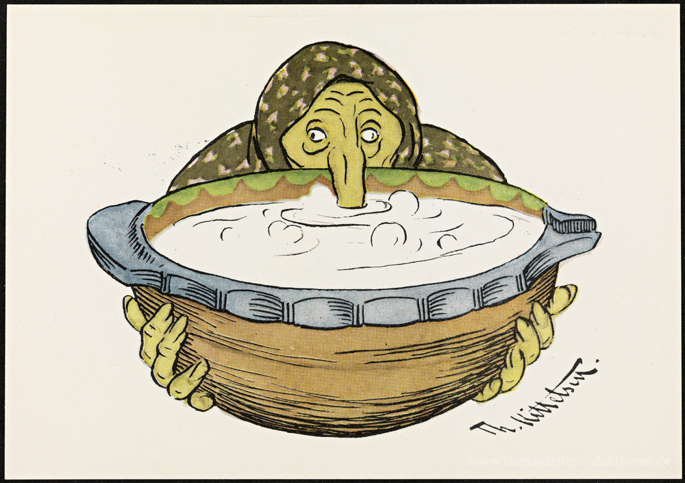 Wir bieten Ihnen eine handgefertigte Reproduktion auf Leinwand des berühmten Kunstwerks 'Guri med suppetrynet' von Theodor Severin Kittelsen, aus dem Reproduktionsmuseum.