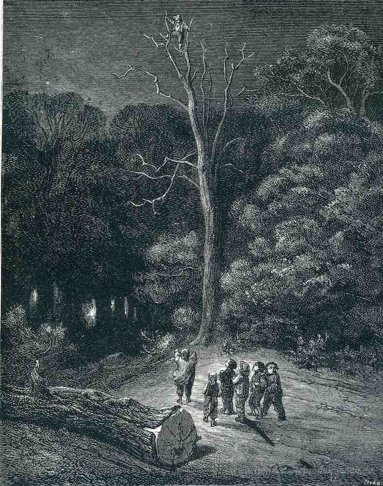 Wir bieten Ihnen eine handgefertigte Reproduktion auf Leinwand des berühmten Kunstwerks 'Hop O My Thumb Klettert nach oben von einem hohen Baum zu sehen,' von Gustave Dore, aus dem Reproduktionsmuseum.