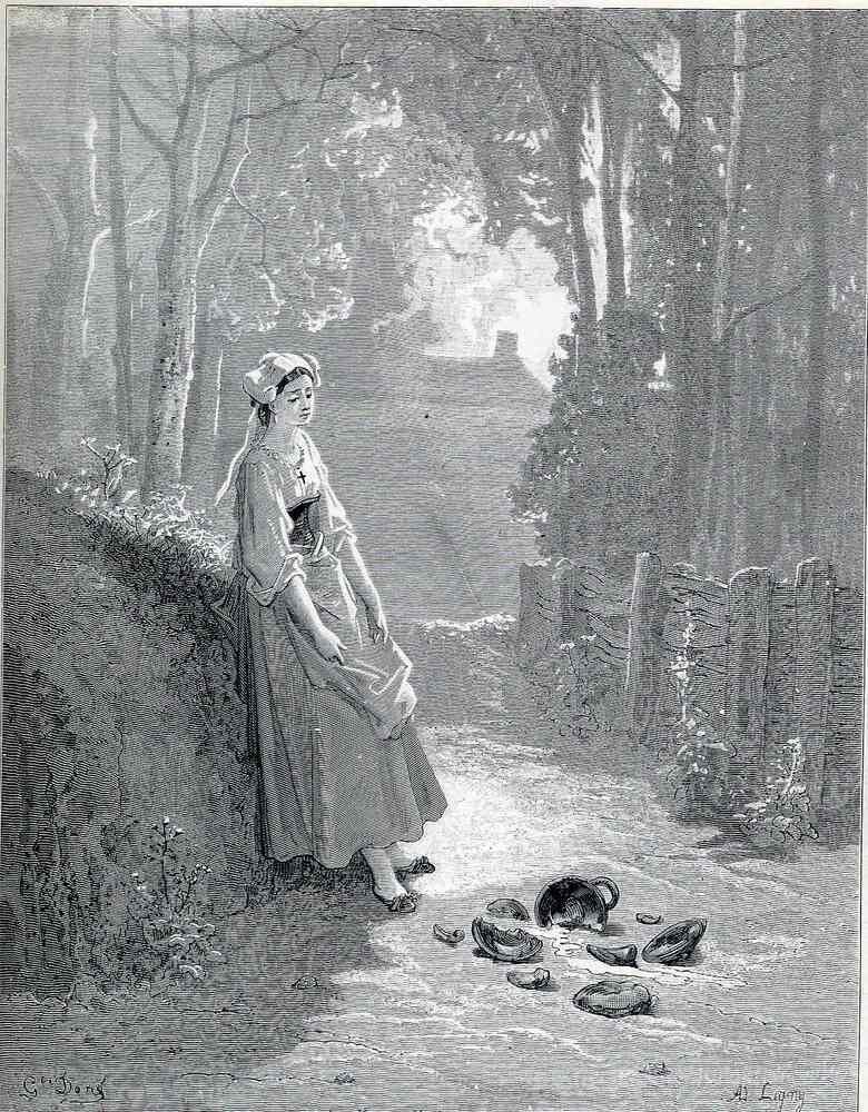 Wir bieten Ihnen eine handgefertigte Reproduktion auf Leinwand des berühmten Kunstwerks 'Illustration für das Milchmädchen und die Milch' von Gustave Dore, aus dem Reproduktionsmuseum.