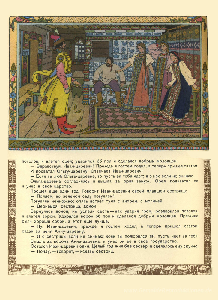 Wir bieten Ihnen eine handgefertigte Reproduktion auf Leinwand des berühmten Kunstwerks 'Illustration für den russischen Fairy Story "Maria Morevna"' von Ivan Bilibin, aus dem Reproduktionsmuseum.