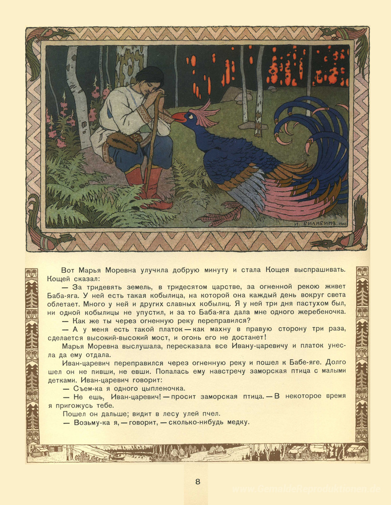 Wir bieten Ihnen eine handgefertigte Reproduktion auf Leinwand des berühmten Kunstwerks 'Illustration für den russischen Fairy Story "Maria Morevna"' von Ivan Bilibin, aus dem Reproduktionsmuseum.