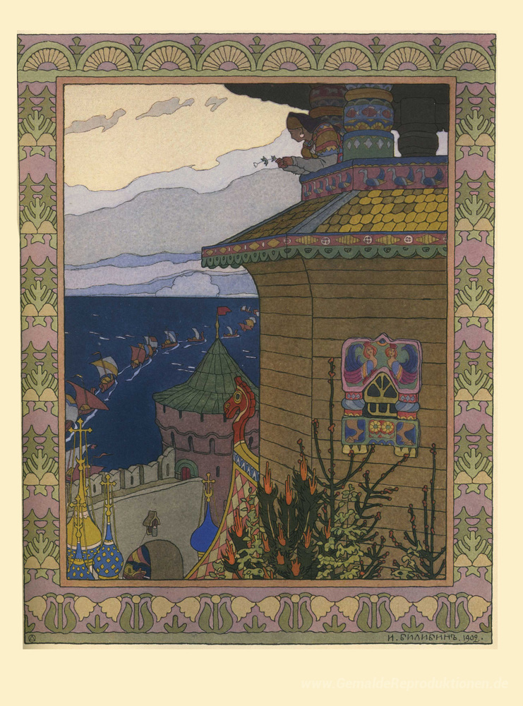 Die dynamischen Formen und die fesselnde Erzählweise in Bilibins Werken schaffen nicht nur eine visuelle Freude, sondern beeinflussen auch die Atmosphäre Ihres Raumes entscheidend. Dieses Ölgemälde verleiht jedem Interieur eine magische Note und fördert eine harmonische und inspirierende Umgebung. Lassen Sie sich von der Kunst des Ivan Bilibin verzaubern und bringen Sie zeitlose Eleganz in Ihr Zuhause.